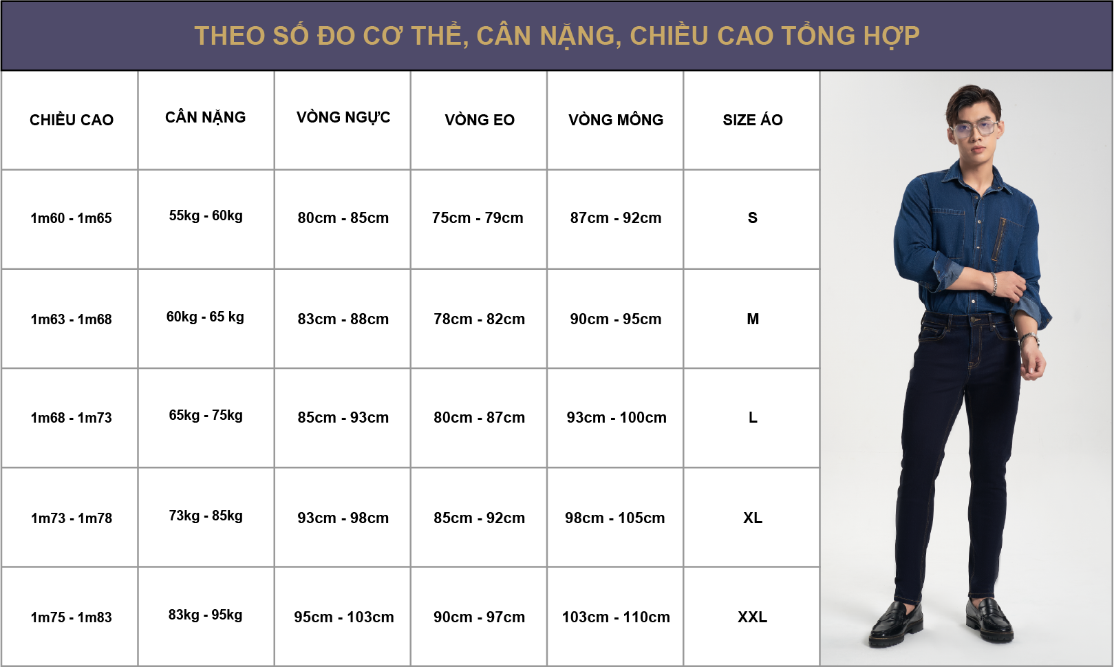 Size quần 30 - Áo sơ mi M - Áo thun M - Áo khoác L
