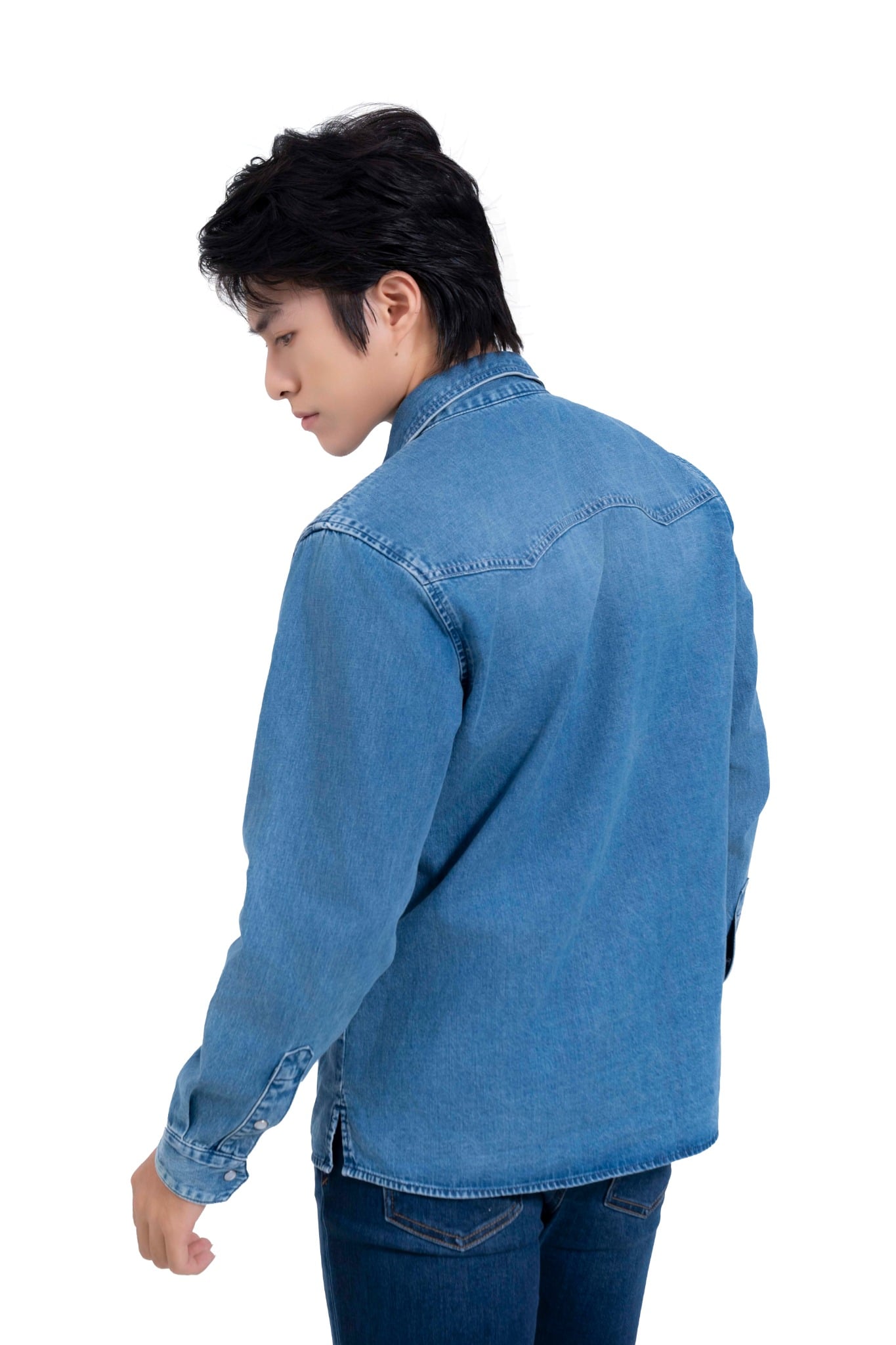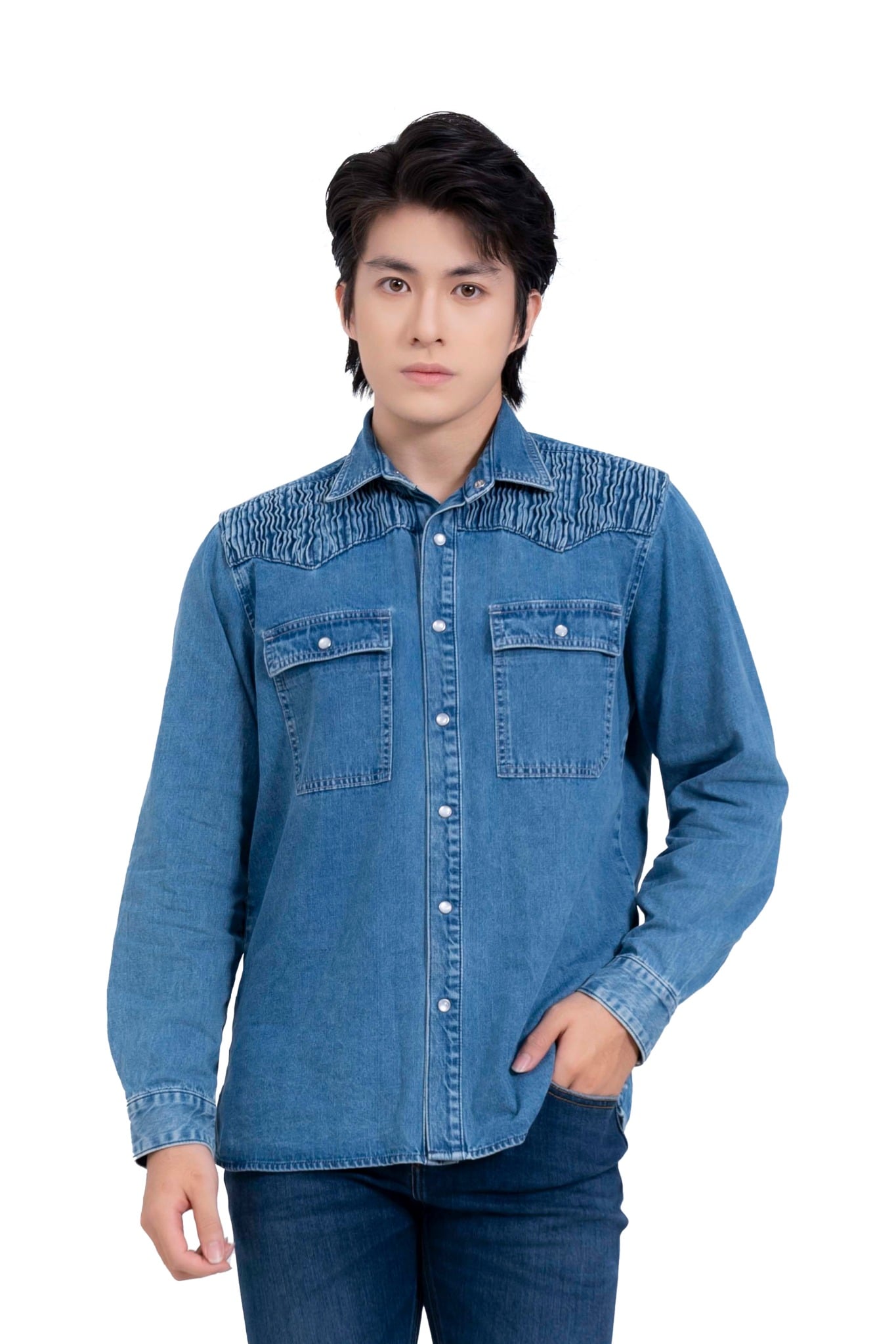 Áo Sơ Mi Denim Nam Hoạ Tiết Dập Ly Vai Áo Màu Xanh Nhạt - Men's Light Blue Denim Shirt with Pleated Shoulders - 125MD4049F1
