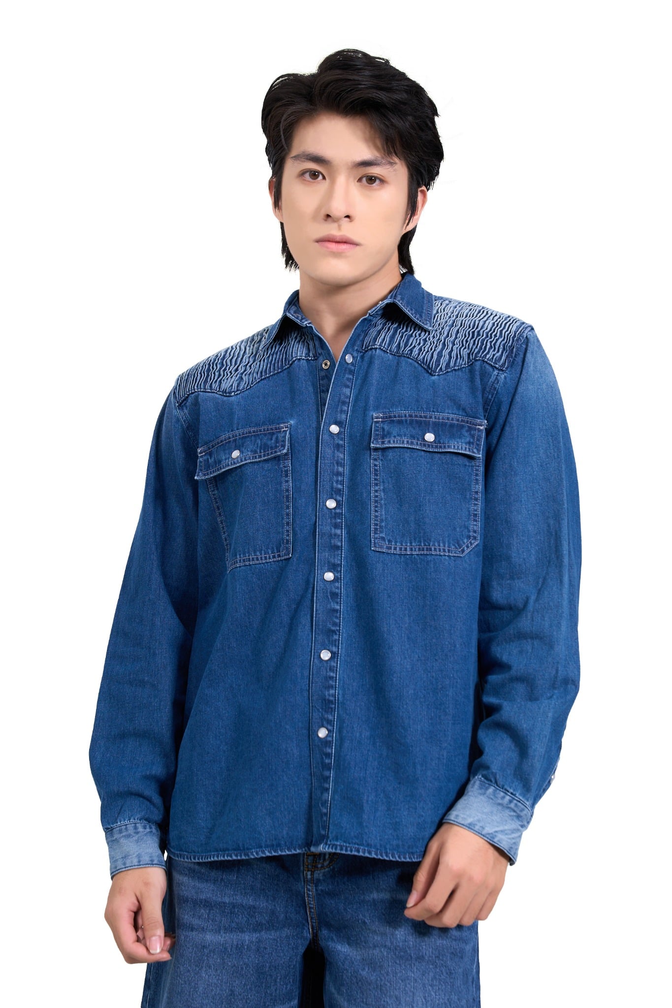 Áo Sơ Mi Denim Nam Hoạ Tiết Dập Ly Vai Áo Màu Xanh Med Blue - Men's Medium Blue Denim Shirt with Pleated Shoulders - 125MD4049F1
