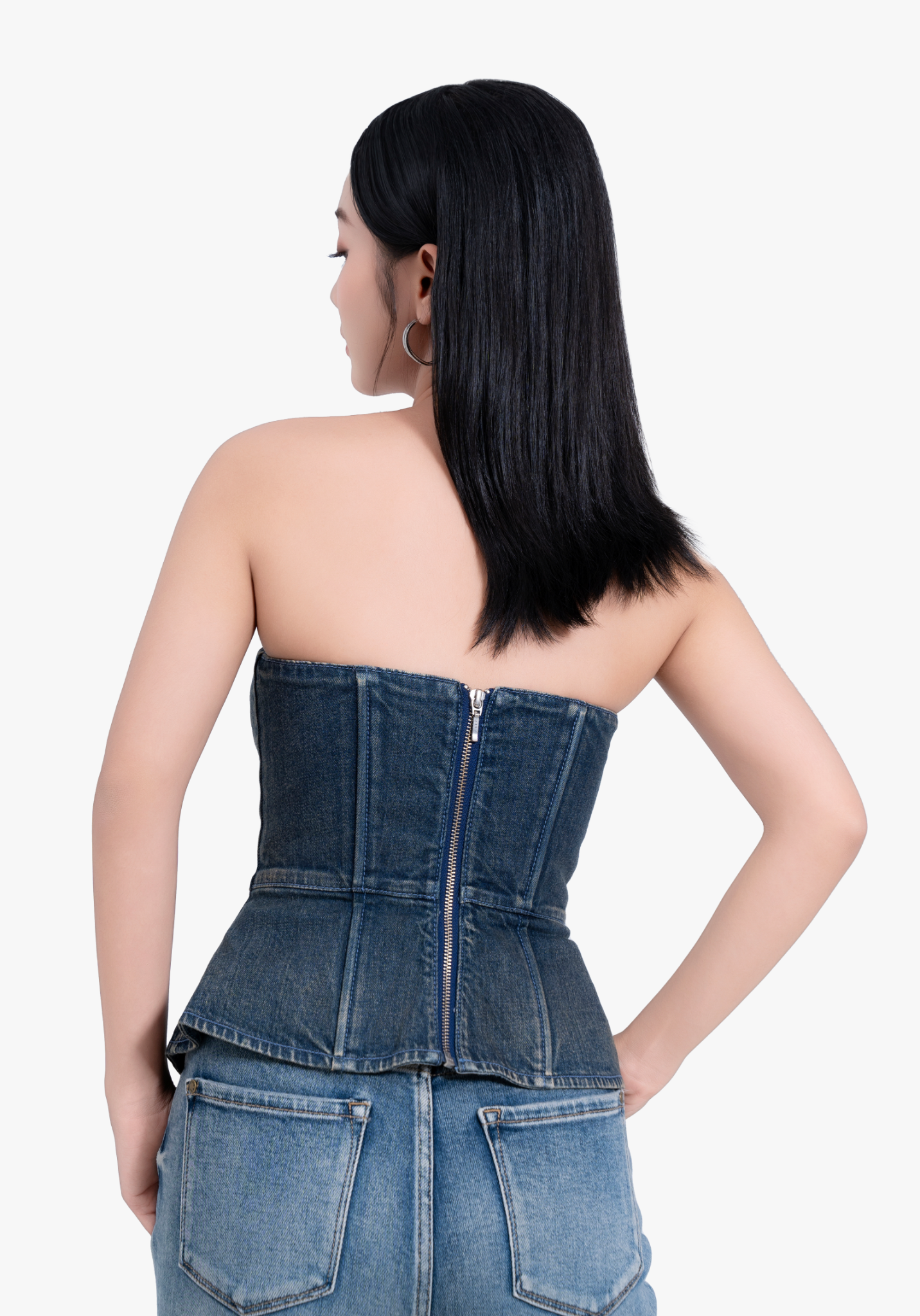Corset Denim Top With Cups với gam màu xanh đậm phủ tint nhẹ, được wash loang sáng dần về phía vạt, tạo hiệu ứng mềm mại hiện đại.