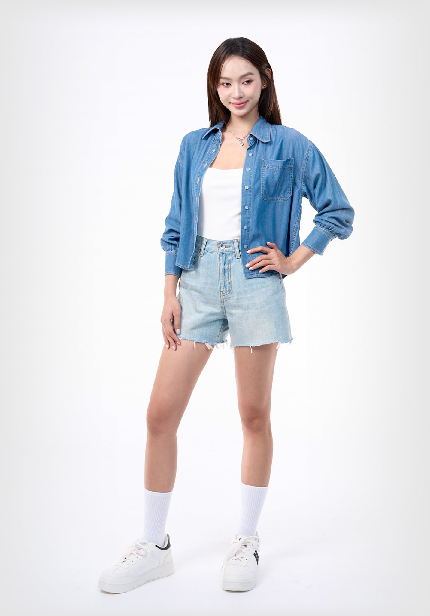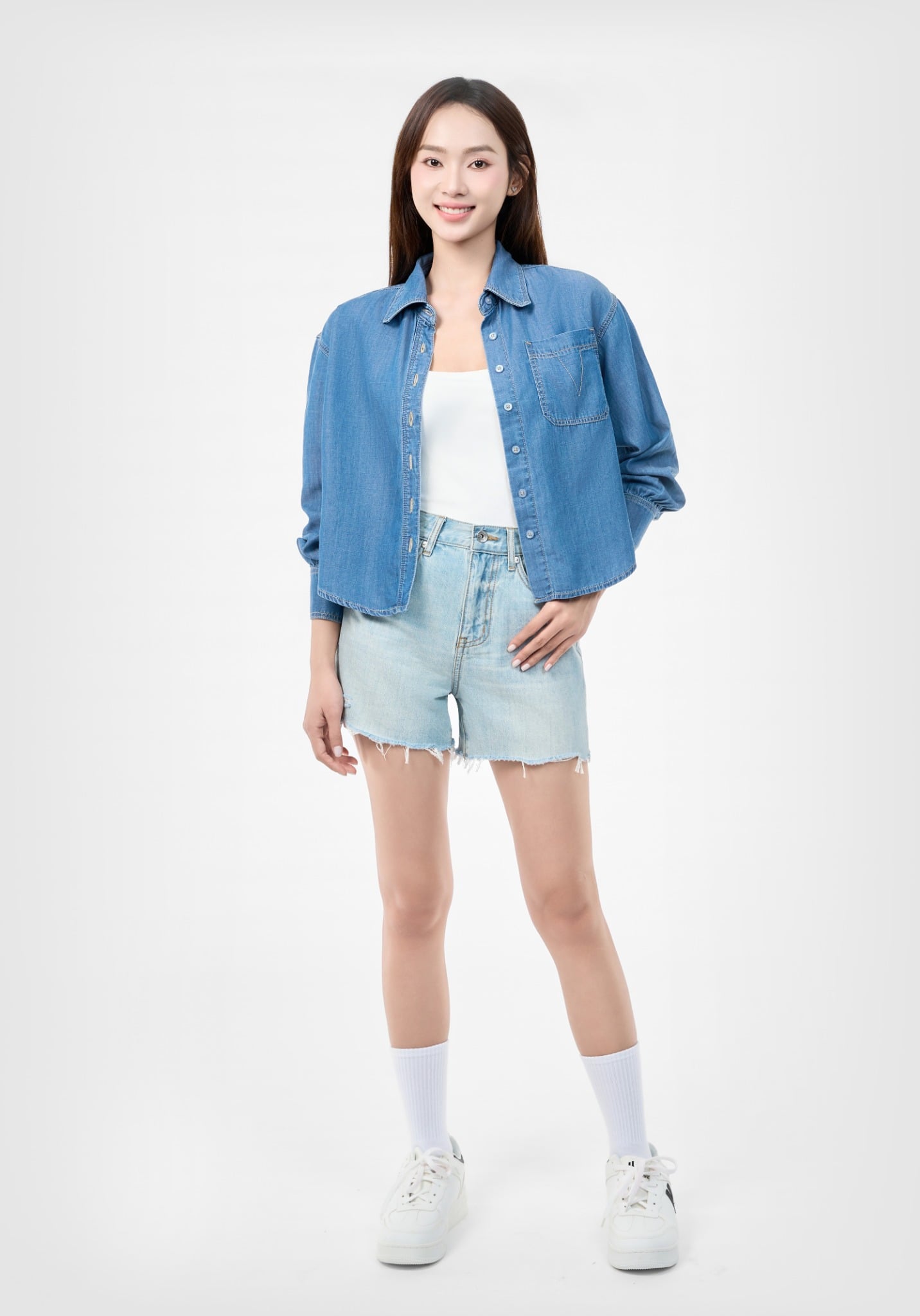 ÁO SƠ MI DENIM MEDIUM BLUE FORM CROP RỘNG DÀI TAY