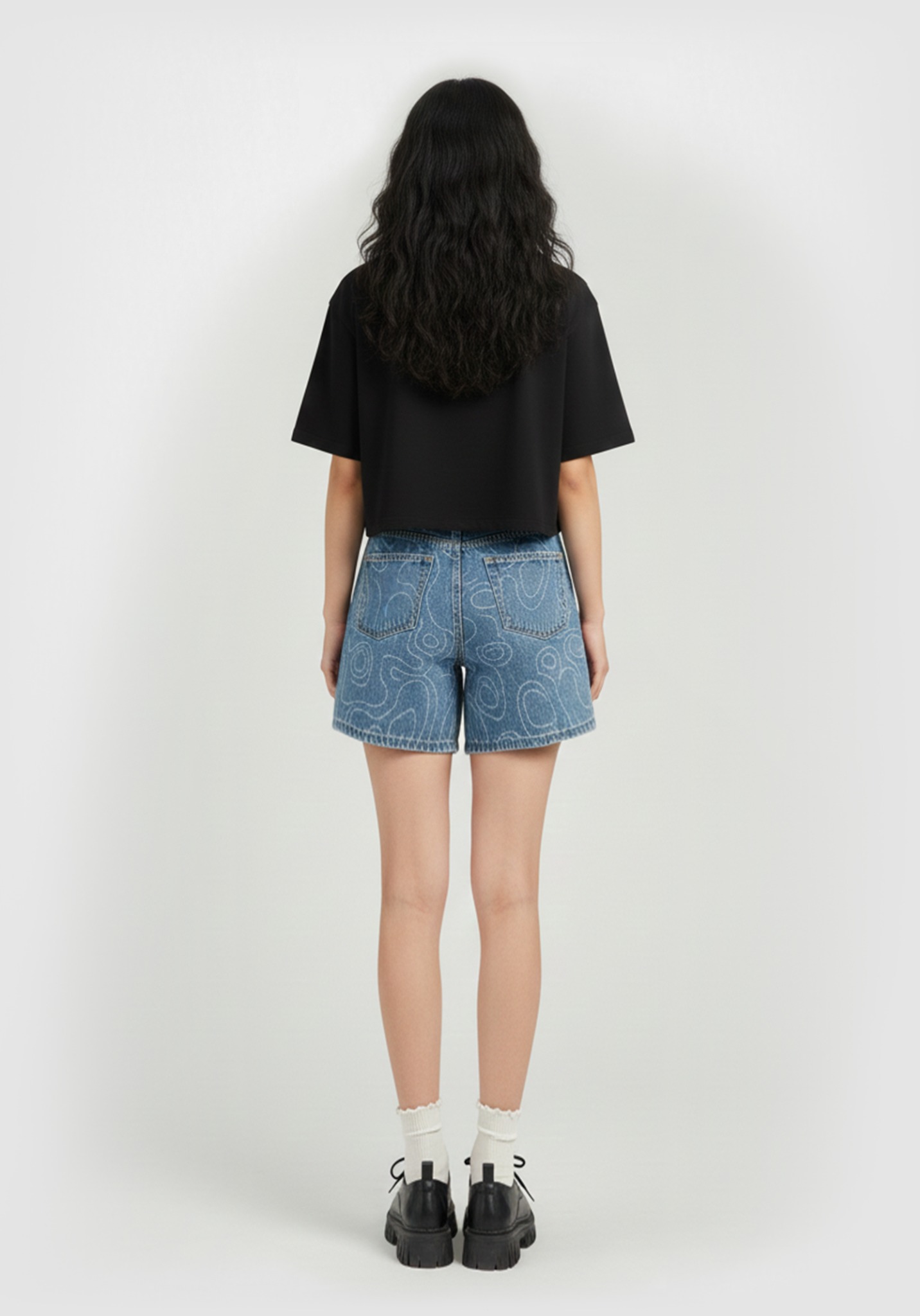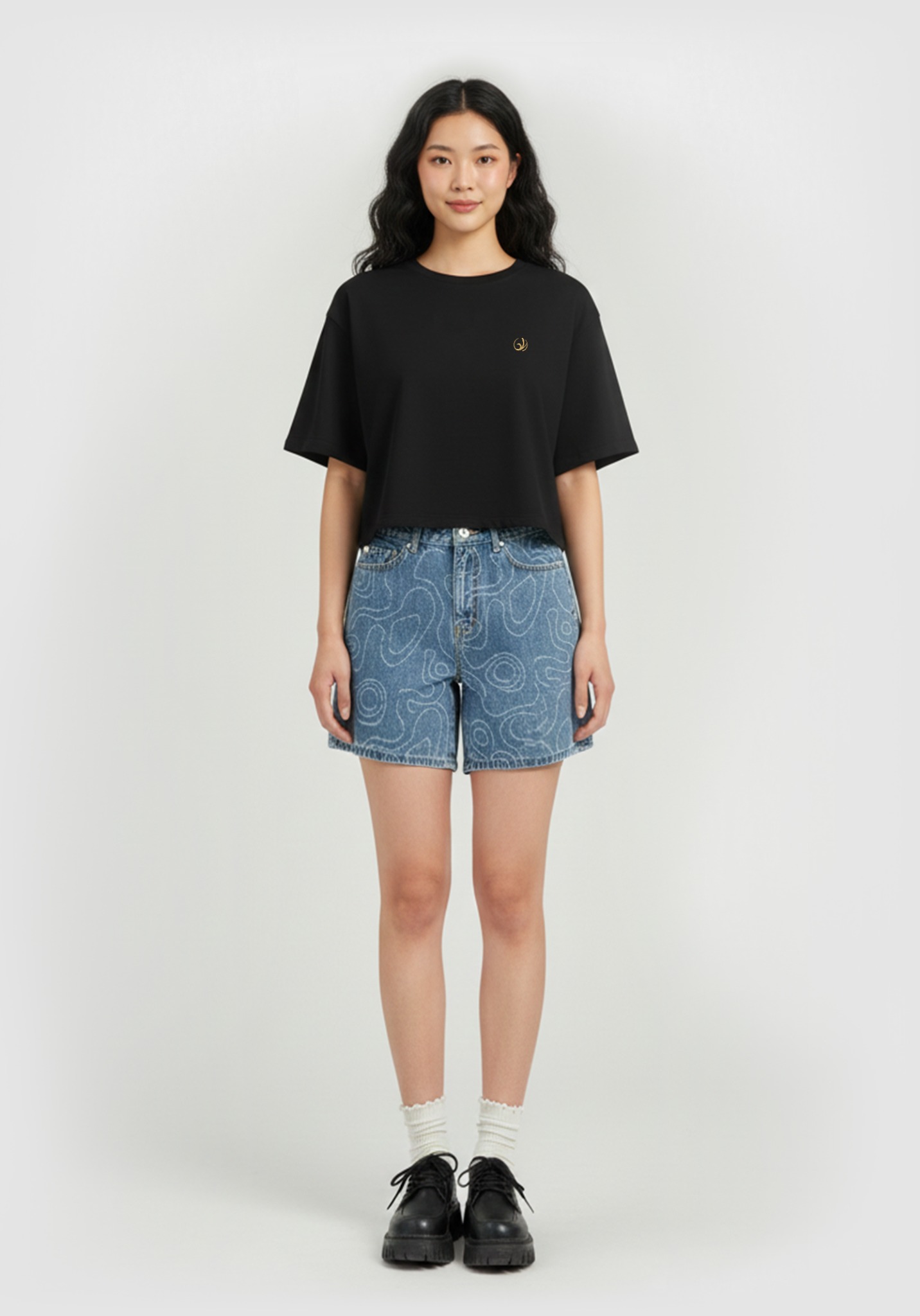 ÁO THUN NỮ DÁNG CROP RỘNG MÀU ĐEN IN LOGO TRÒN