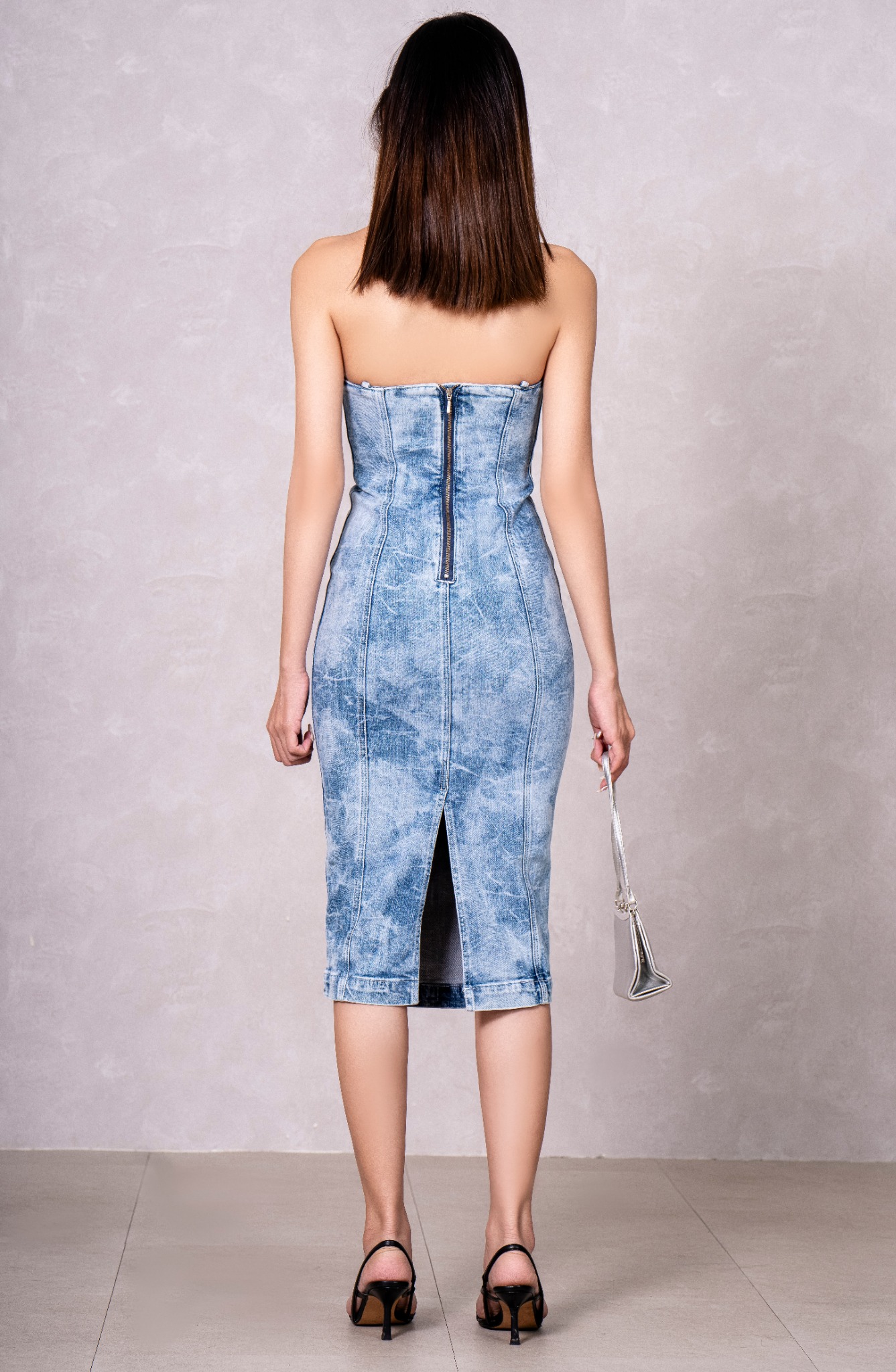 Phom dáng đầm cúp ngực dáng ôm body màu xanh sáng - Đính kèm dây áo ngực denim có thể tháo lắp