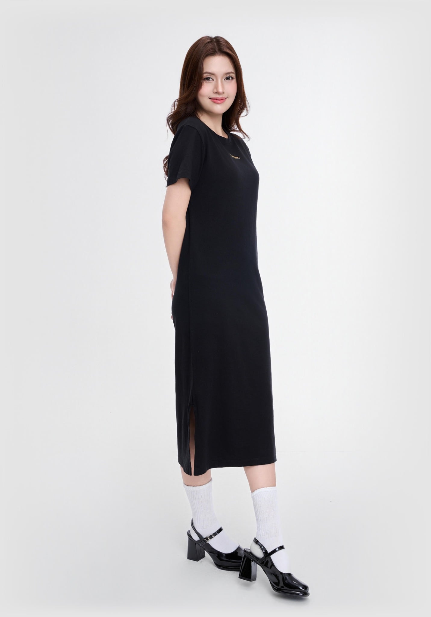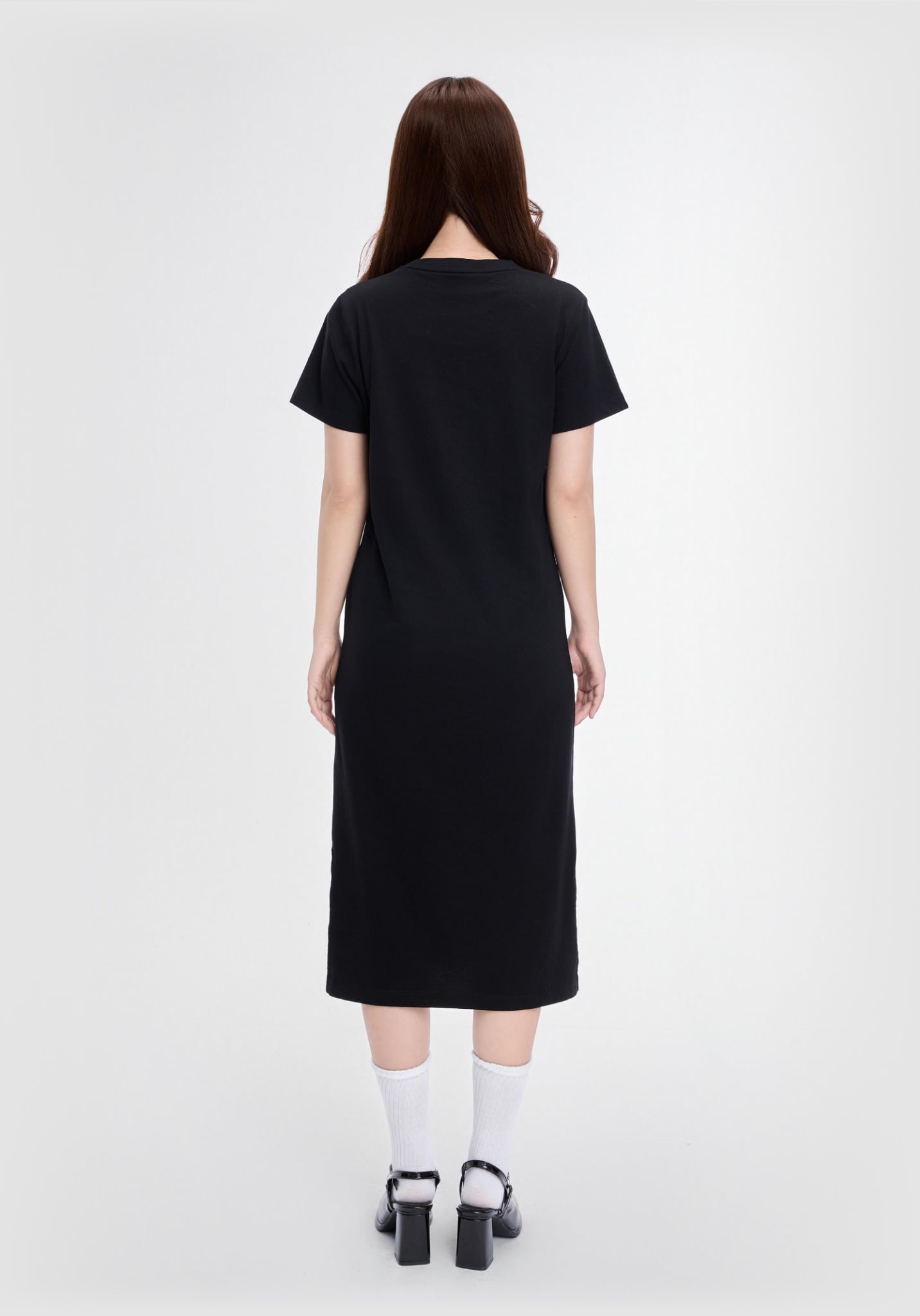 ĐẦM THUN NỮ DÁNG SUÔNG DÀI XẺ TÀ 2 BÊN MÀU ĐEN IN CHỮ KÝ V-SIXTYFOUR