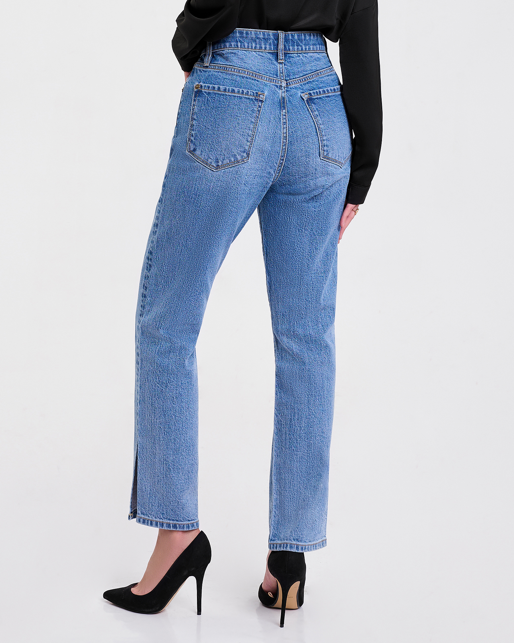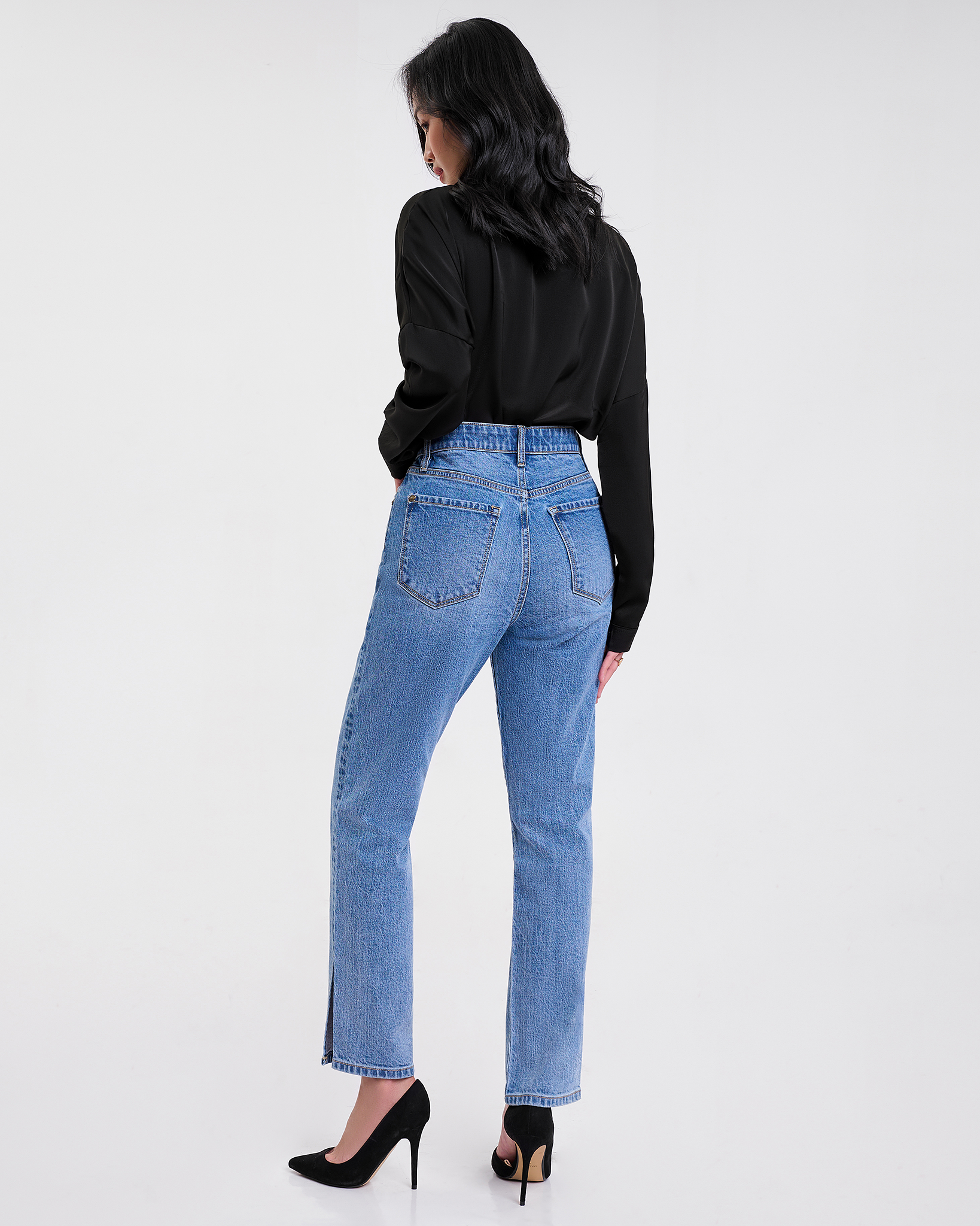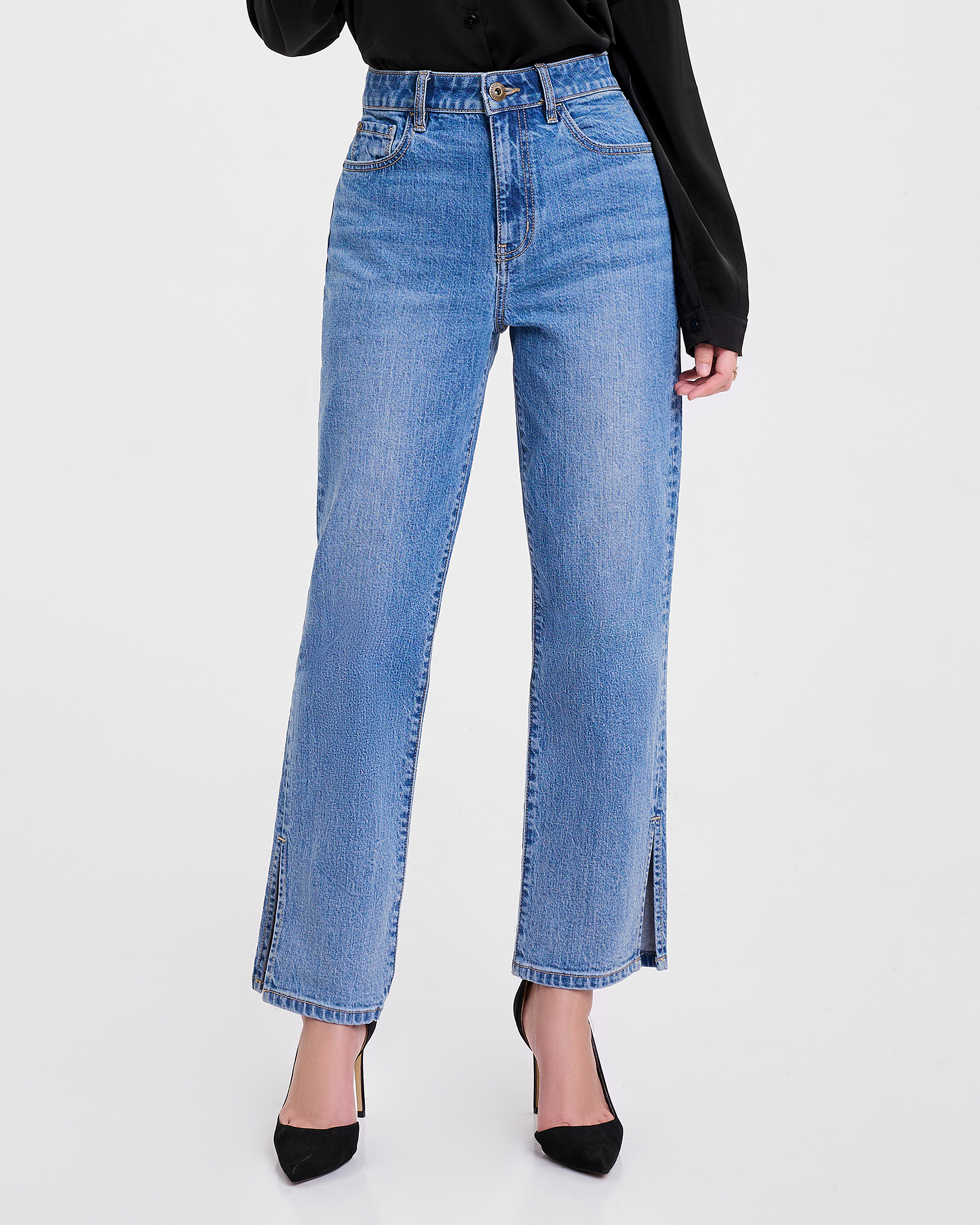 Quần Jeans Nữ Xẻ Lai Dáng Suông. Split Hem Straight Jeans với chi tiết xẻ lai chính điểm nhấn để thuyết phục các cô nàng công sở thời thượng. Không chỉ giúp các nàng dễ phối với nhiều kiểu giày như boots, hoặc cao gót, mà còn tạo hiệu ứng đôi chân nàng thanh thoát hơn.