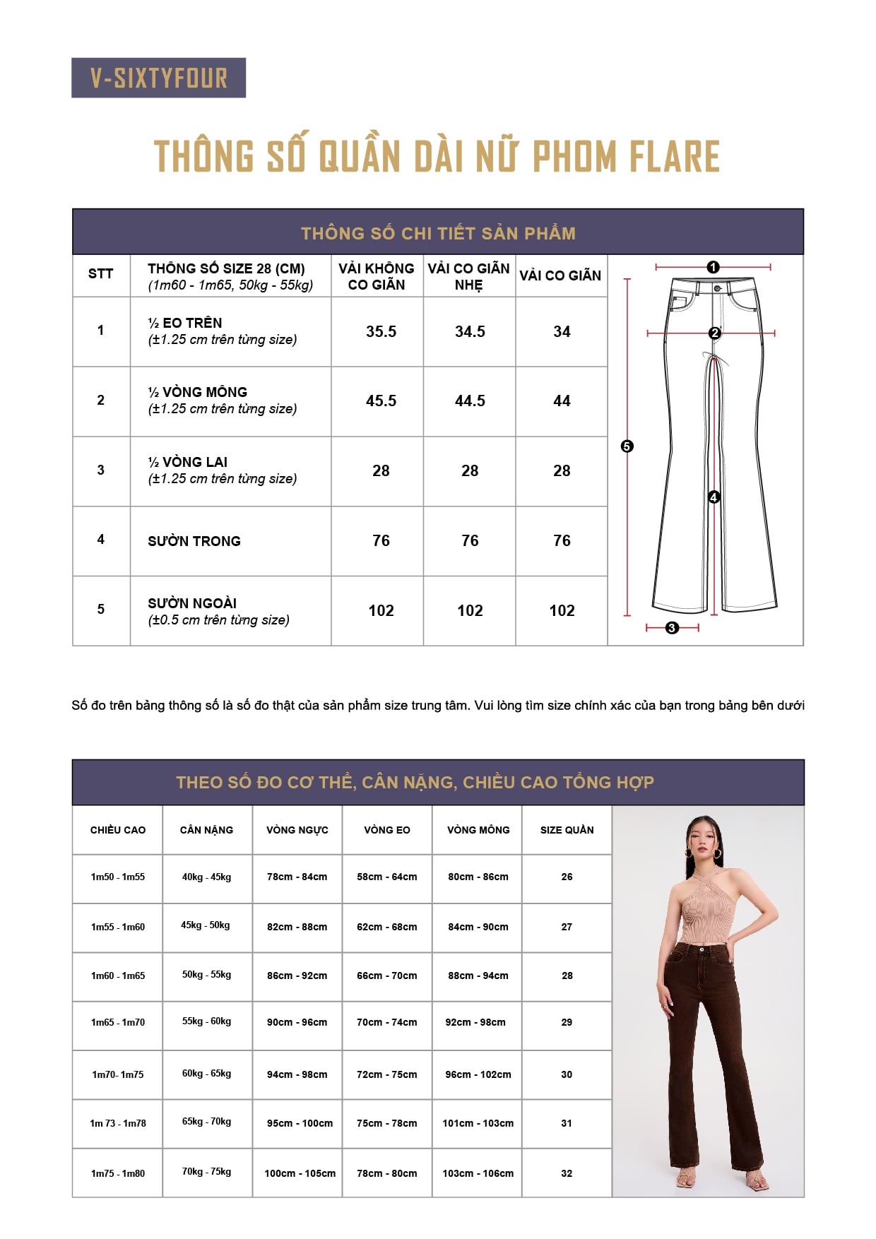 • Dáng Loe Rộng: Quần dài dáng loe mở rộng từ đầu gối trở xuống, tạo sự thoải mái tối ưu và vẻ ngoài thanh thoát, dễ dàng di chuyển