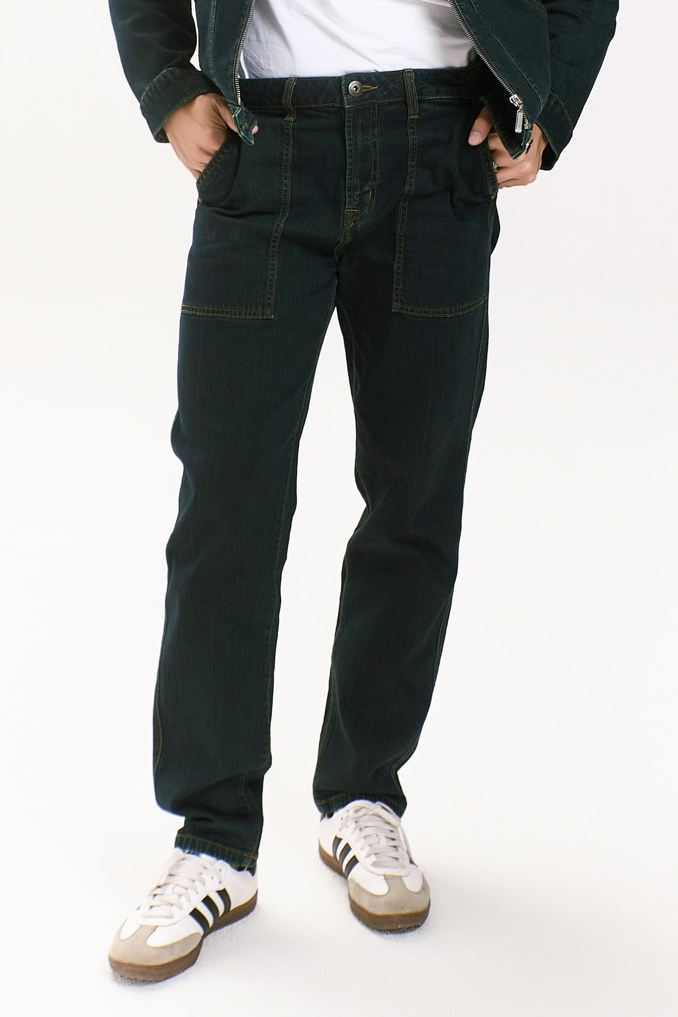Men's jeans dyed moss green with box bag