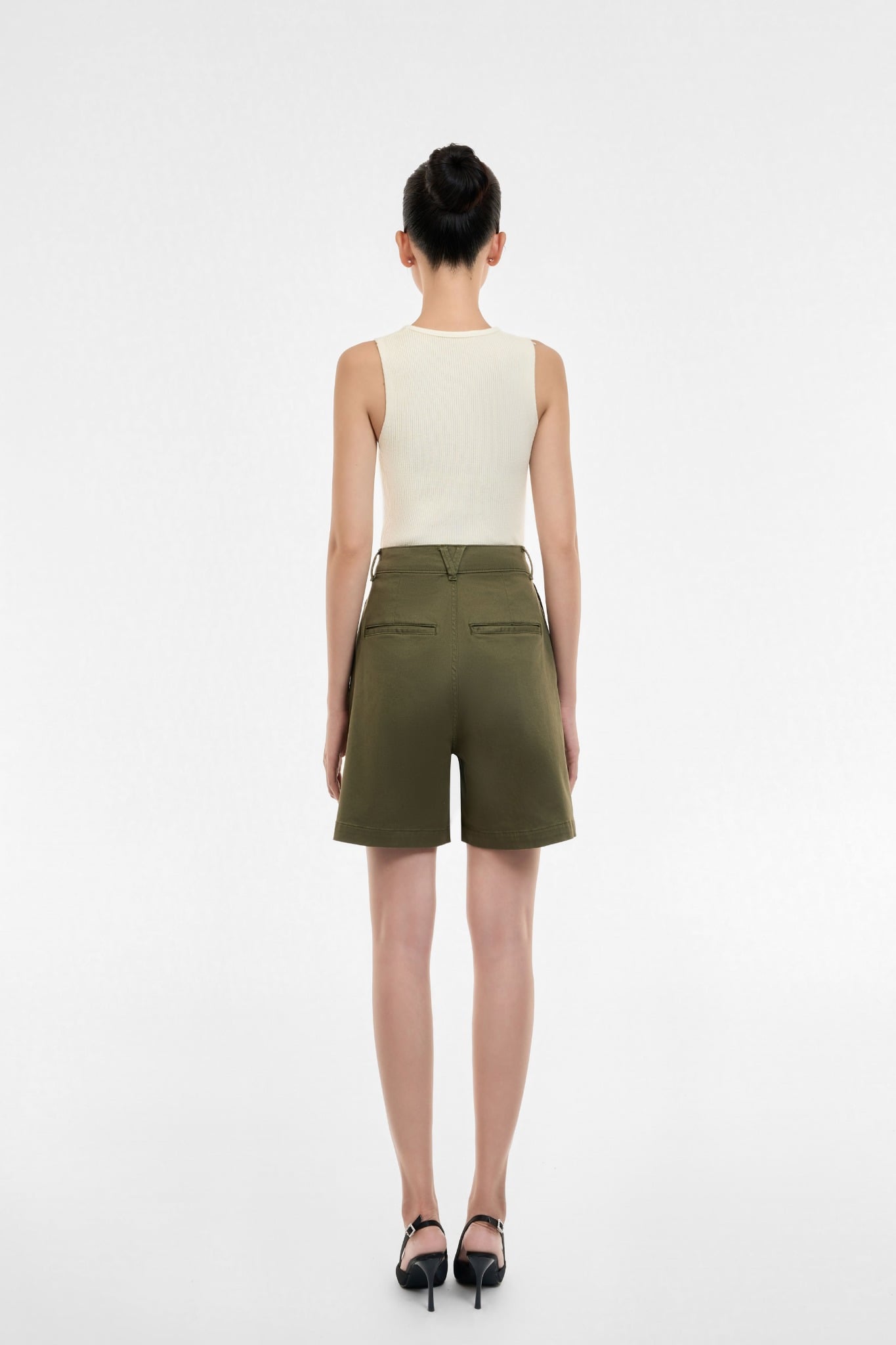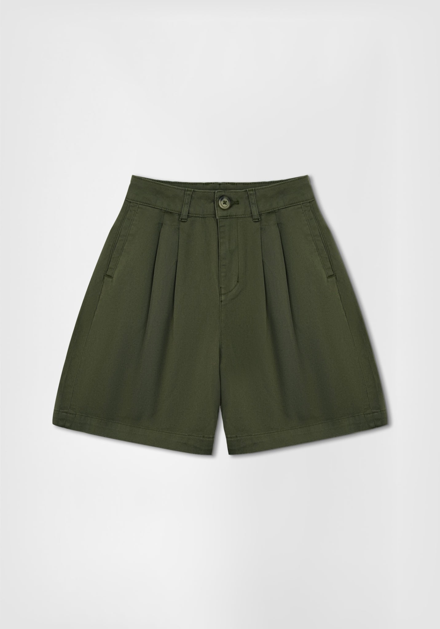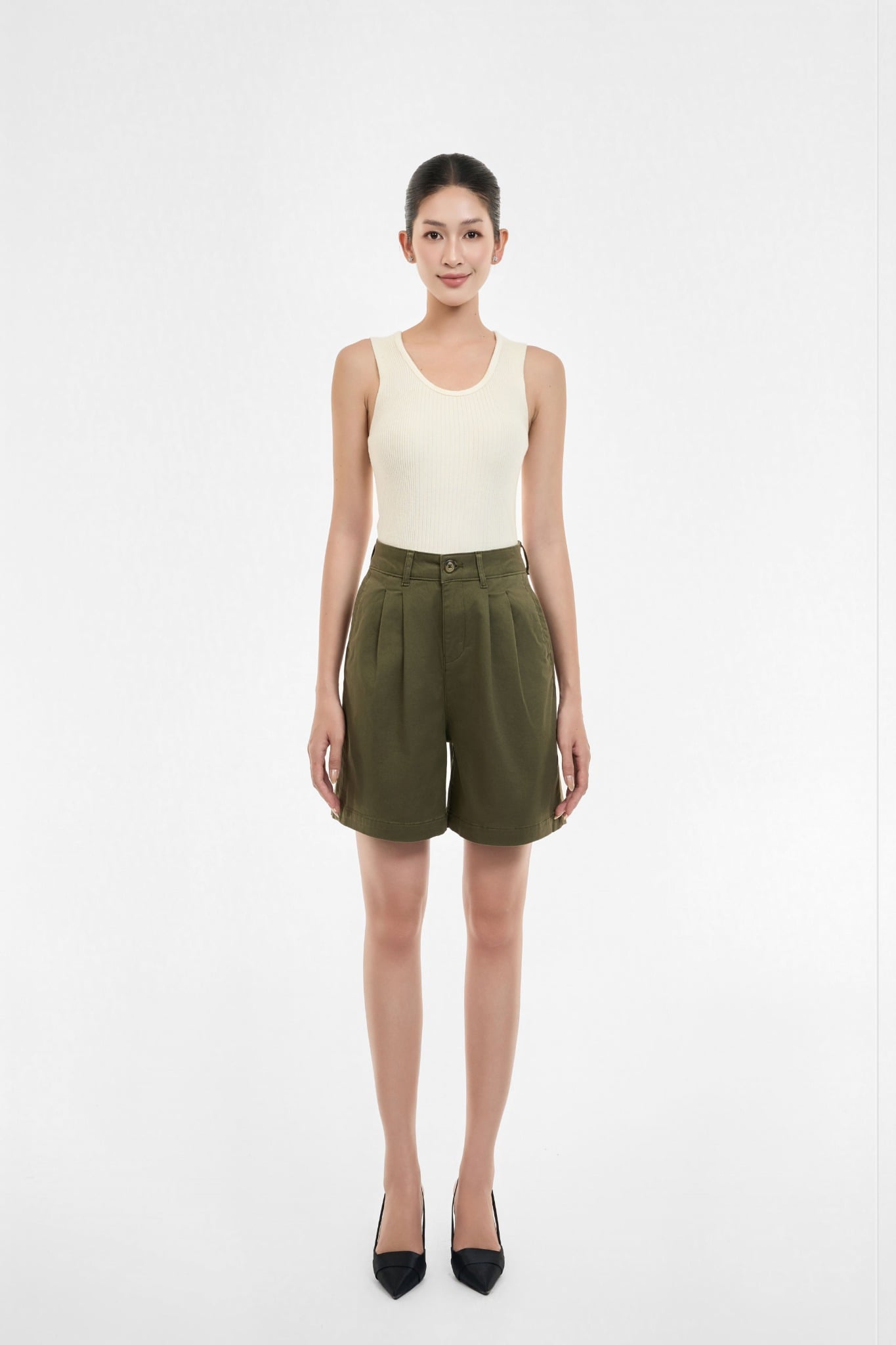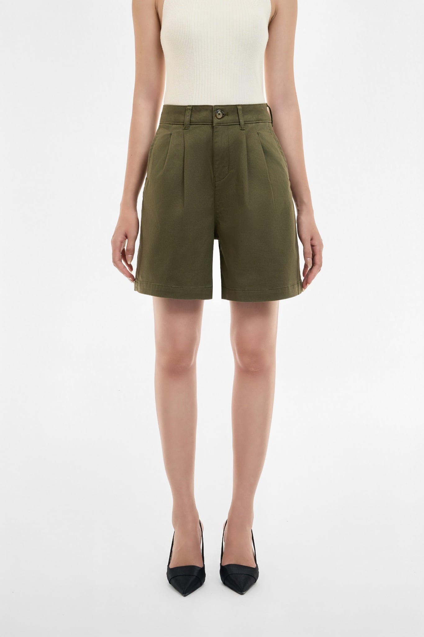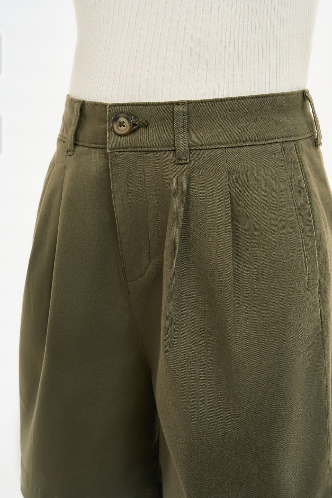 QUẦN SHORTS NỮ KAKI XANH RÊU XẾP LY FORM RỘNG