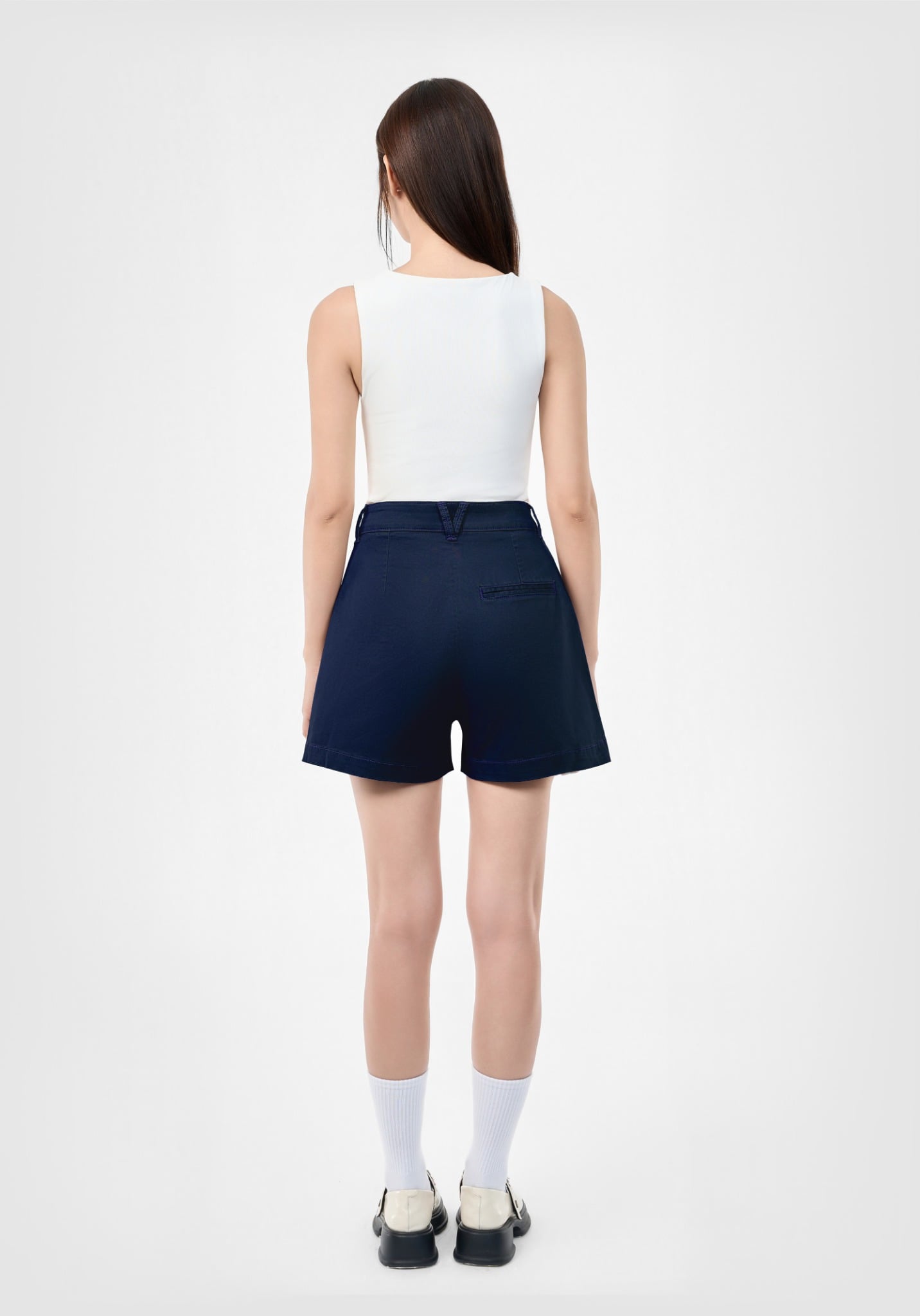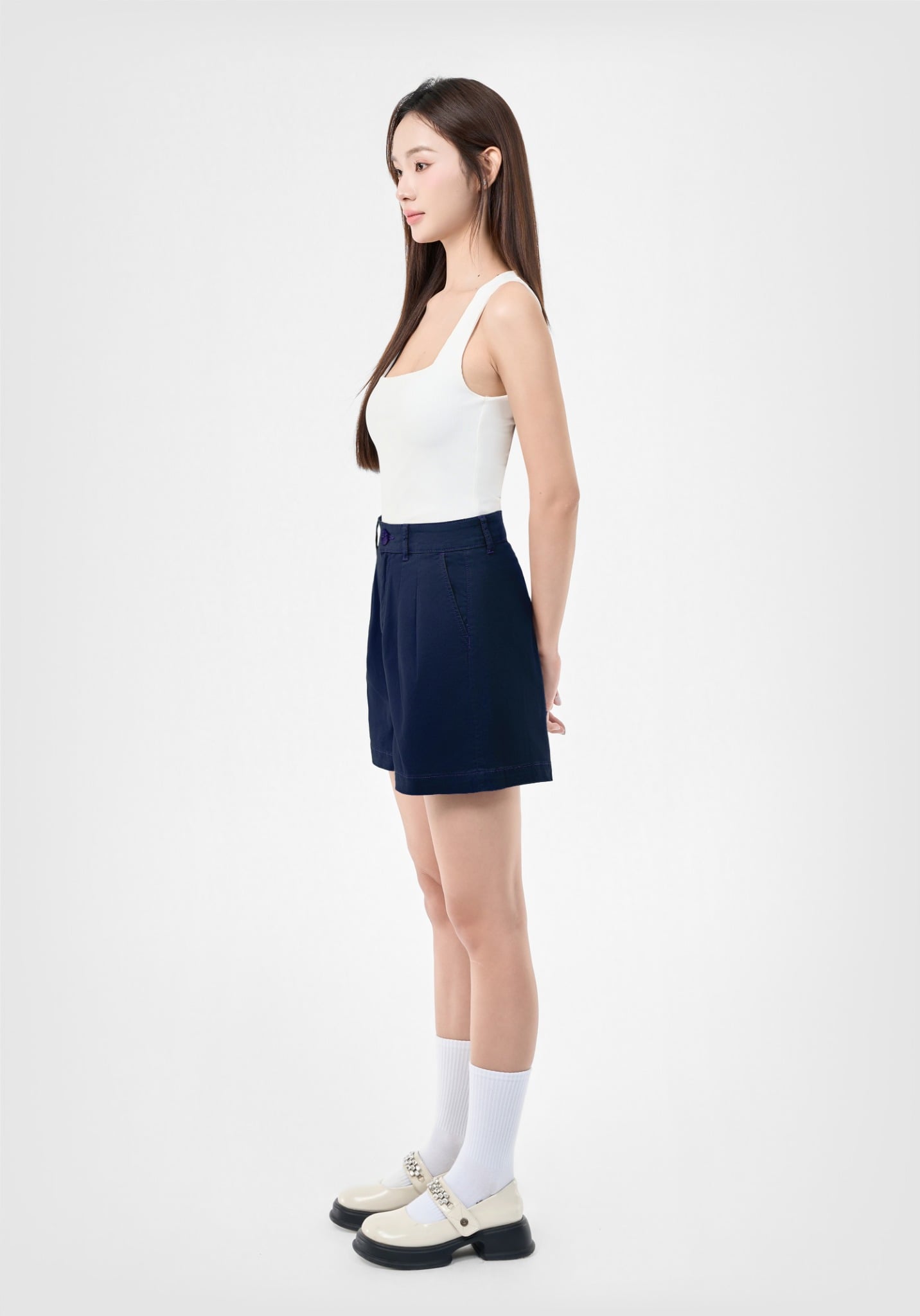 QUẦN SHORTS NỮ KAKI  NAVY TÚI XÉO FORM RỘNG