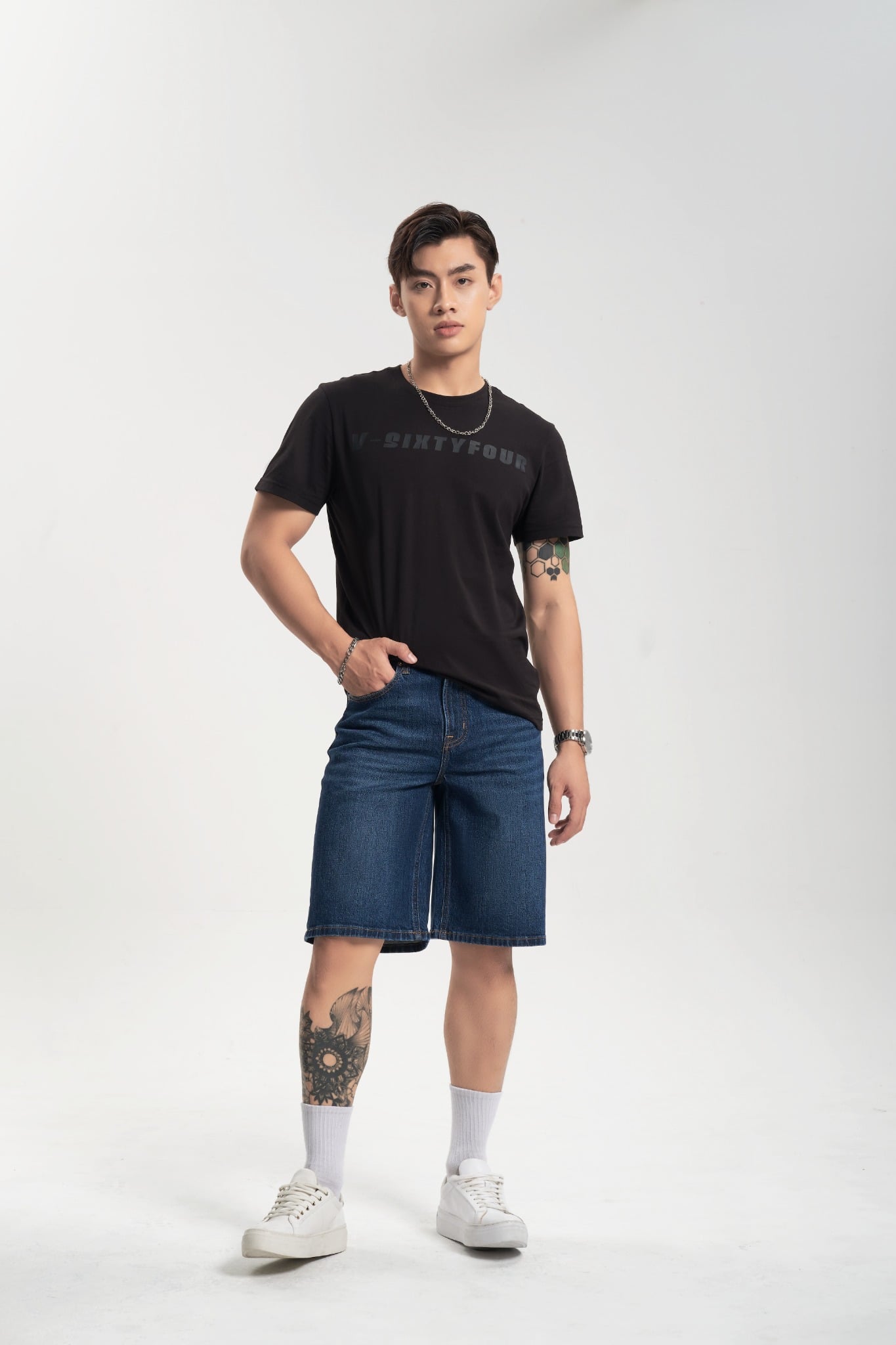 Quần short jeans dáng rộng.